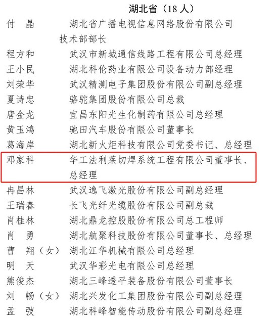 近日,工業和信息化部對全國工業和信息化系統先進集體、勞動模范和先進工作者擬表彰對象名單進行公示,華工科技核心子公司孝感華工高理電子有限公司(以下簡稱“華工高理”)入選“全國工業和信息化系統先進集體”,華工科技子公司華工法利萊切焊系統工程有限公司(以下簡稱“華工法利萊”)董事長、總經理鄧家科入選“全國工業和信息化系統勞動模范”。