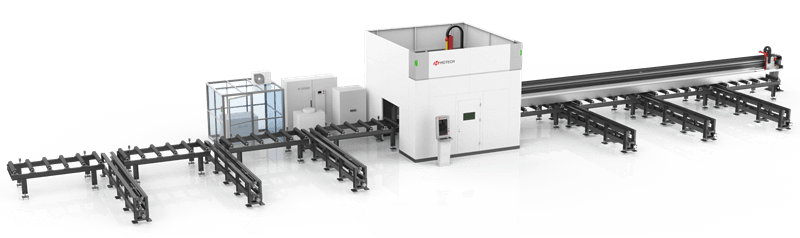 實(shí)現(xiàn)備料緩存、自動(dòng)上料、輥道輸送、夾持推進(jìn)送料、夾緊定位、自動(dòng)變形檢測及糾偏、激光三維切割(型鋼分段切割、端部坡口切割、翼板及腹板上的開孔及坡口切割加工)、自動(dòng)下料、自動(dòng)排渣、自動(dòng)切割及套料,及電氣控制系統(tǒng)等組成